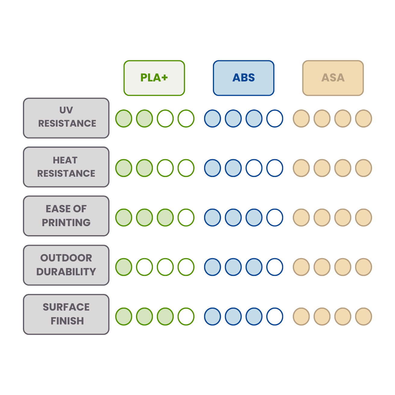 ASA is built for environments where ordinary filaments fall short. It combines outstanding mechanical strength with enduring UV and weather resistance, making it the best choice for outdoor applications and high-performance projects.