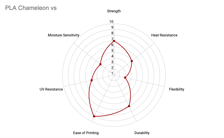 - PLA Chameleon offers a balanced performance profile that focuses on visual quality and ease of use while still delivering dependable strength and durability.