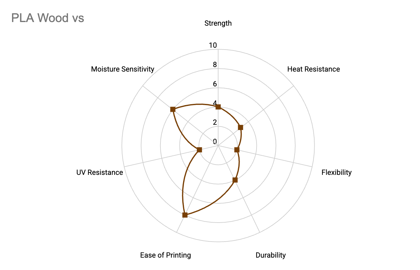 - Moderate moisture sensitivity indicates that proper storage is important to maintain print quality, while lower UV resistance means PLA Wood is best suited for indoor applications.