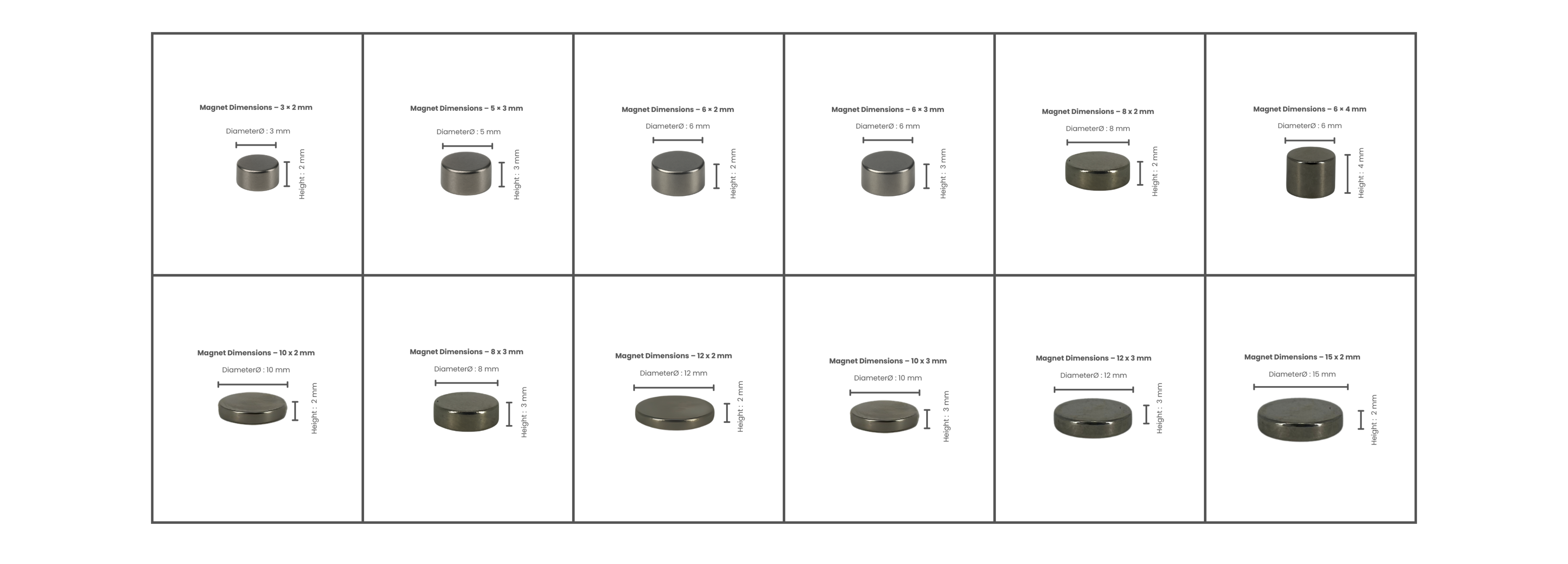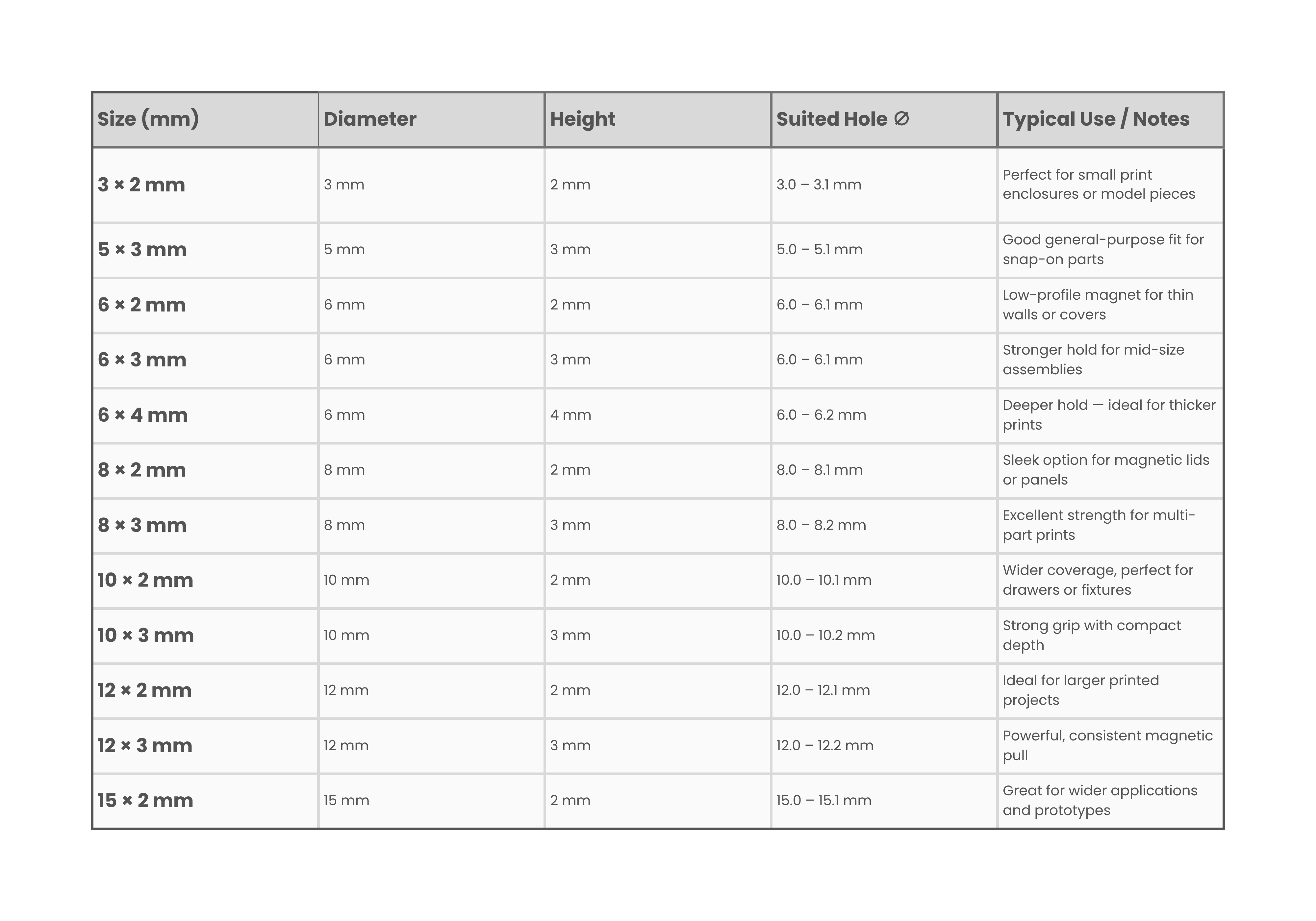 With options ranging from 3×2 mm to 15×2 mm, these high strength rare earth magnets provide secure, long lasting hold across countless 3D printed designs and applications.