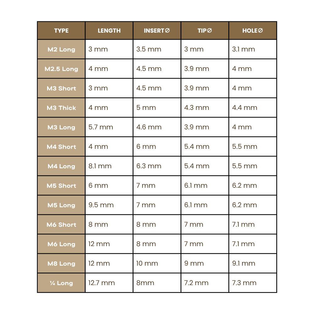 OzFDM offers a complete range of insert sizes, covering everything from M2 to M8 threads (and 1/4”), giving makers full flexibility across all project types. Whether you’re reinforcing small precision components or strengthening larger mechanical joints, there’s an option perfectly matched to your design. Each insert is produced to exact tolerances and rigorously tested to guarantee accuracy, consistency, and an easy fit straight out of the box.